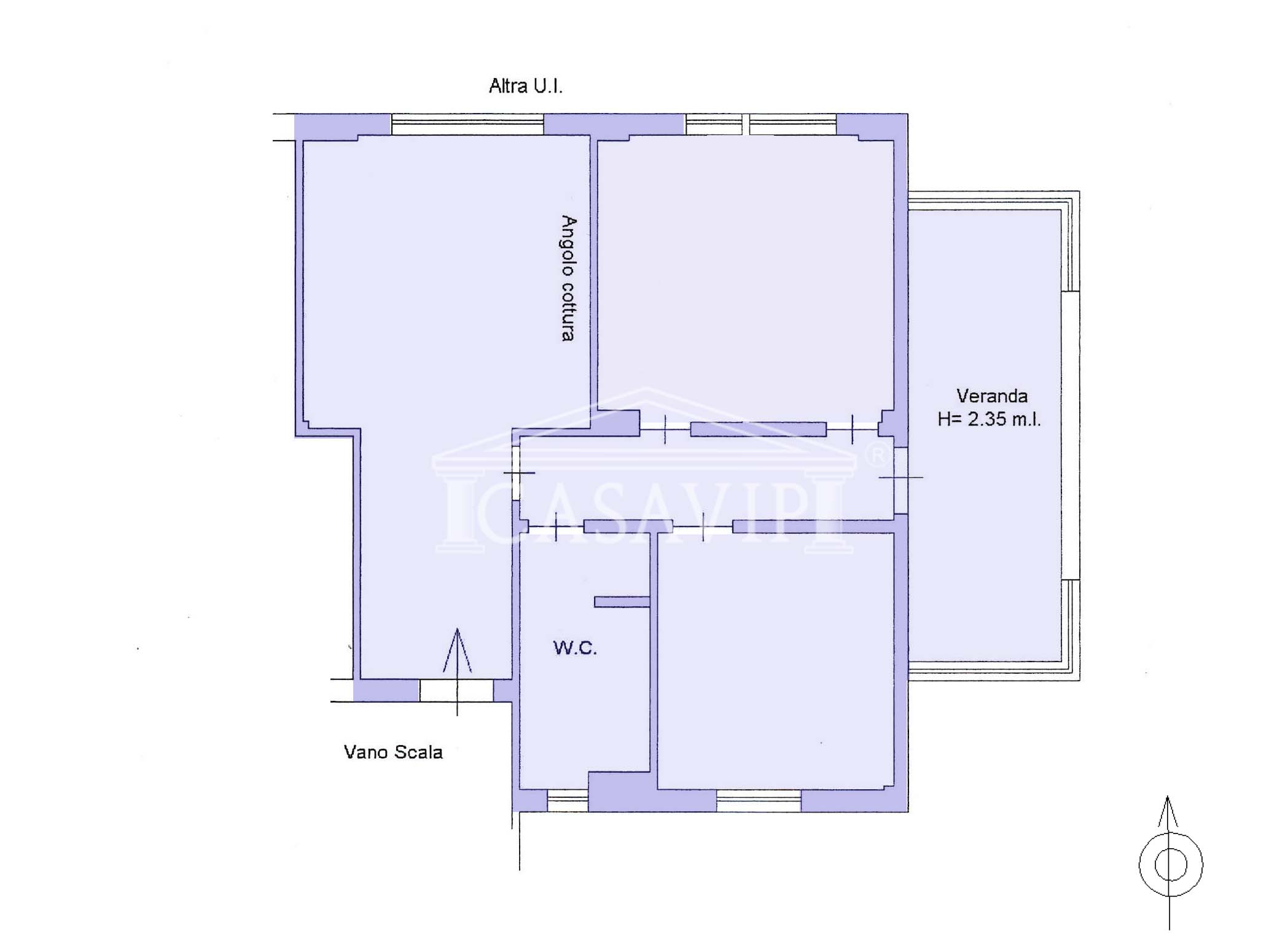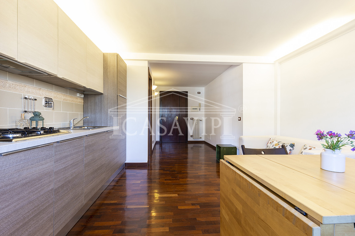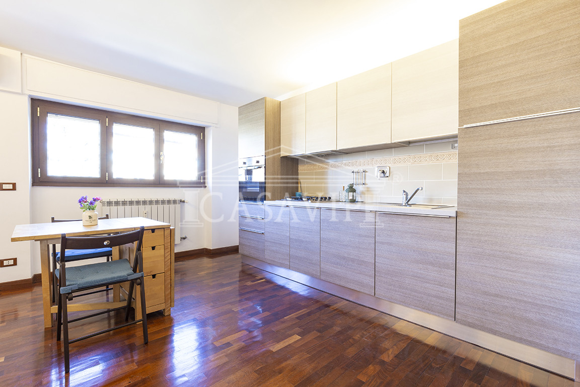L'immobile, collocato al quinto piano superattico e servito da ascensore fino al quarto piano, è distribuito in ampio ingresso, salone con cucina a vista, due camere, bagno e veranda.