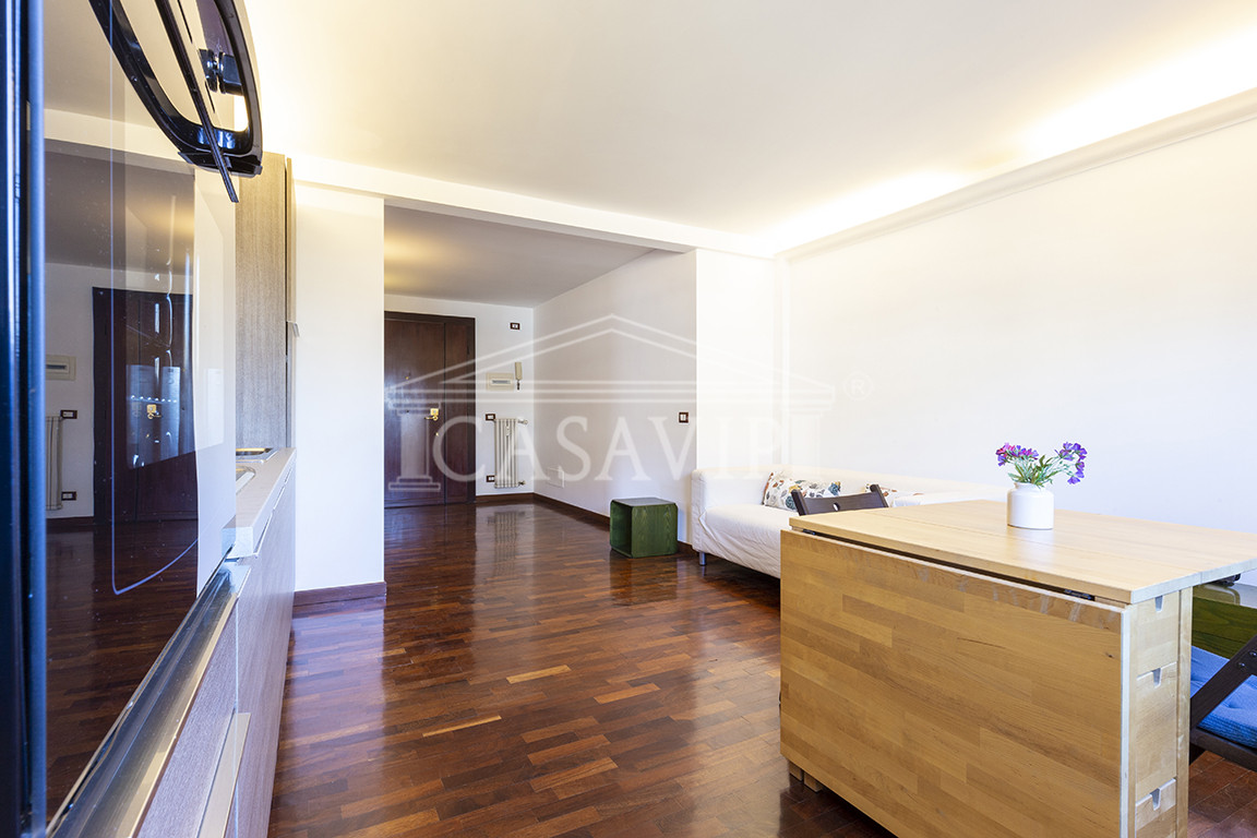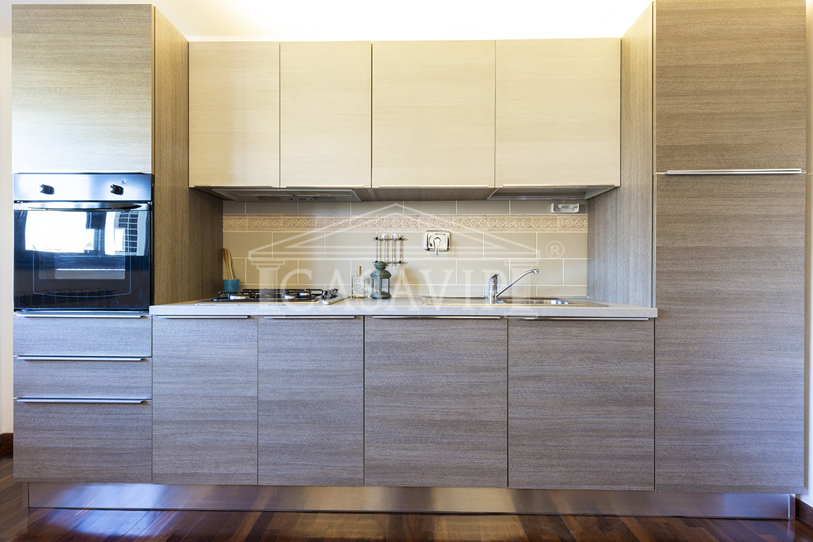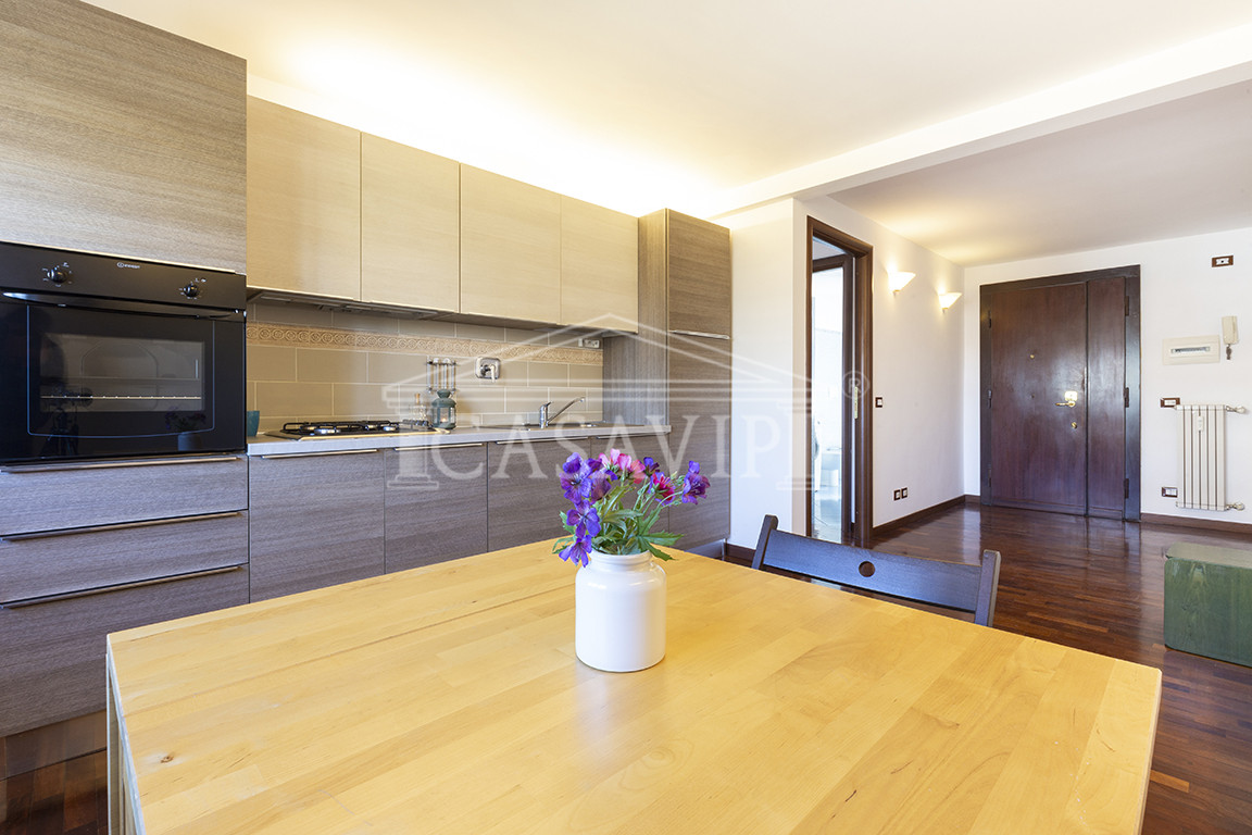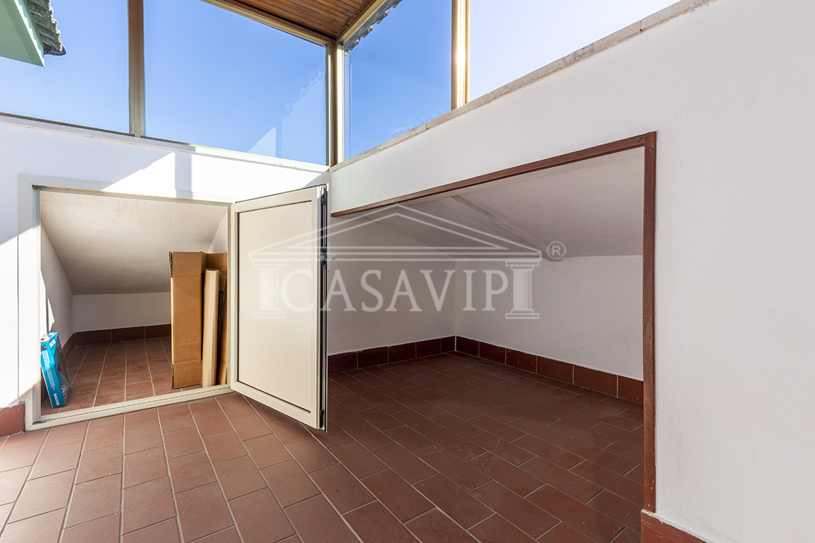 L'immobile, collocato al quinto piano superattico e servito da ascensore fino al quarto piano, è distribuito in ampio ingresso, salone con cucina a vista, due camere, bagno e veranda.