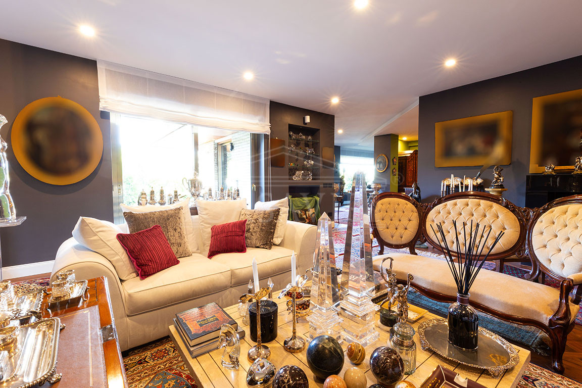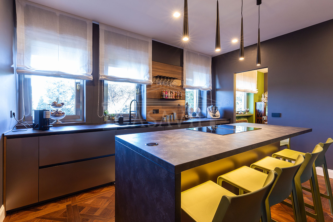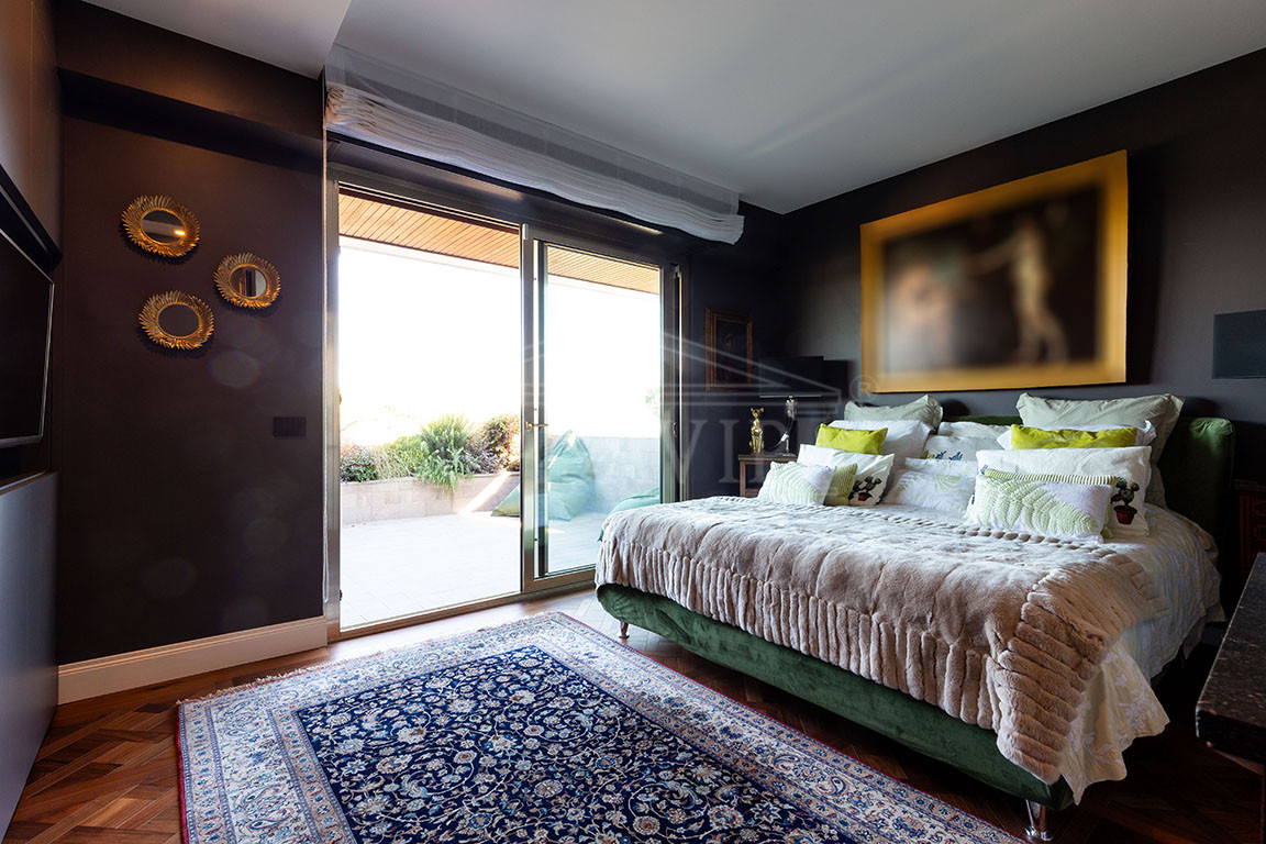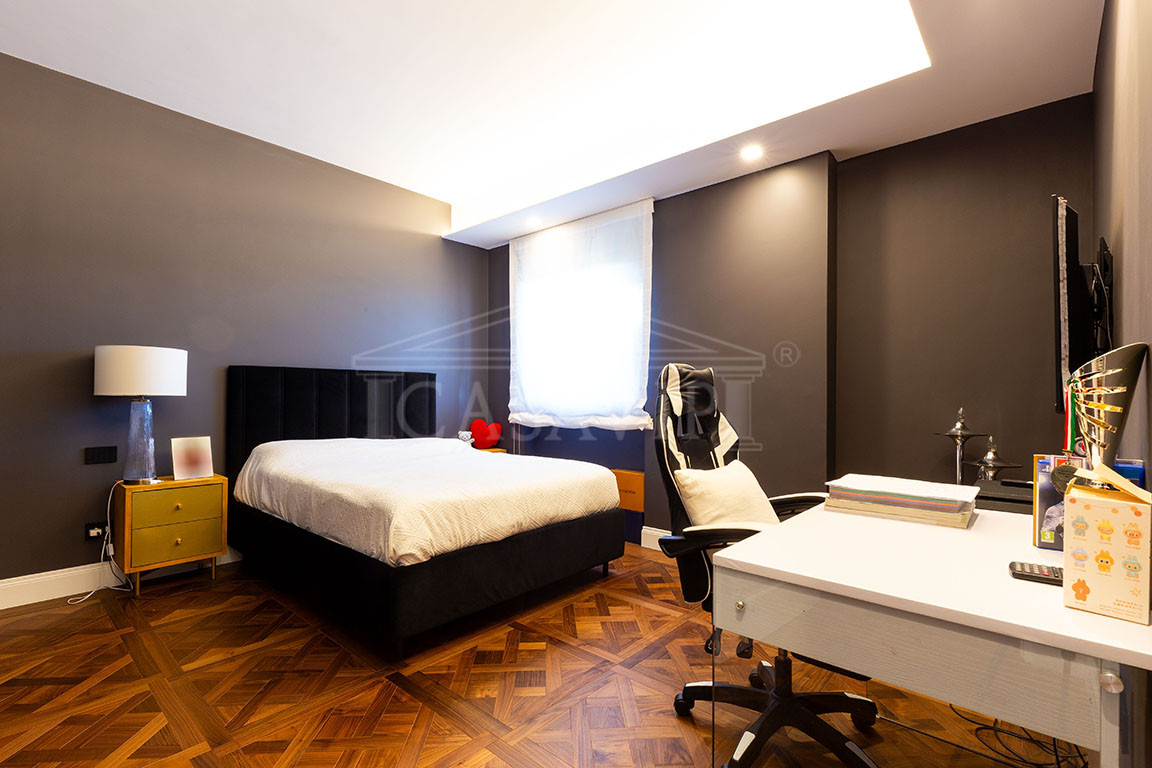 L’abitazione, che si sviluppa sull’intero piano attico della palazzina, con affacci quindi su quattro lati, è composto da doppio ingresso, di cui uno attraverso l’ascensore che apre direttamente dentro la zona accoglienza, grande salone di rappresentanza di oltre 120mq, sala da pranzo, ampia cucina conviviale con isola centrale, contigua camera con bagno interno, attualmente adibita a studio ma ideata per allocare eventuale personale di servizio.