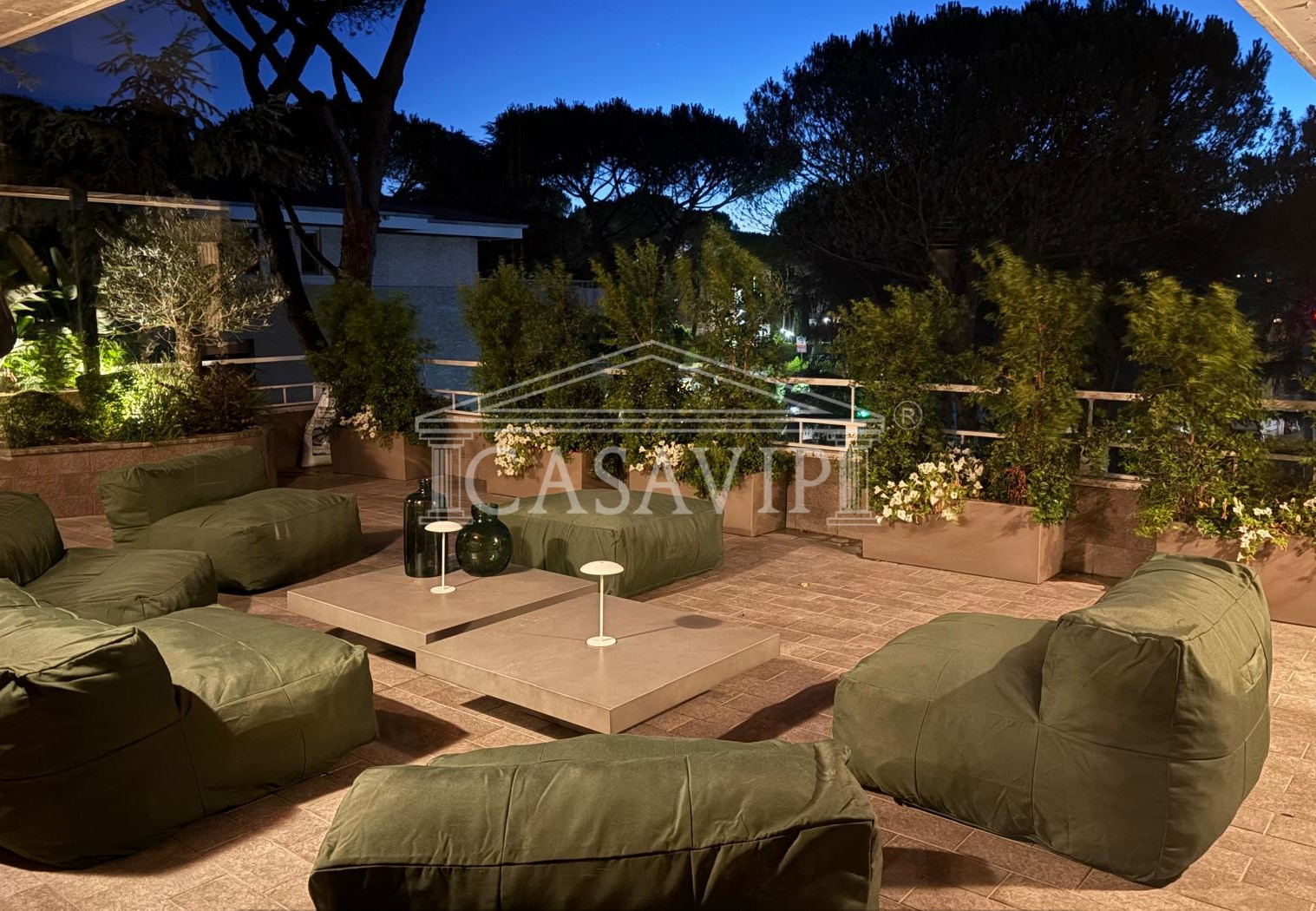 Altrettanto unico è il terrazzo di circa 400mq che corre sui quattro lati regalando varie zone vivibili, allestite come zona pranzo piuttosto che come zona living o solarium con contigua vasca jacuzzi da esterni dalla quale, così come da molti altri punti del terrazzo, si può godere di una meravigliosa vista che spazia dai monti a Nord di Roma, ai Castelli fino alla vista aperta verso il centro città, anch’esso dotato in tutta la sua superficie di nuova pavimentazione di pregio ed interamente attrezzato a verde con sistema di irrigazione automatica.
