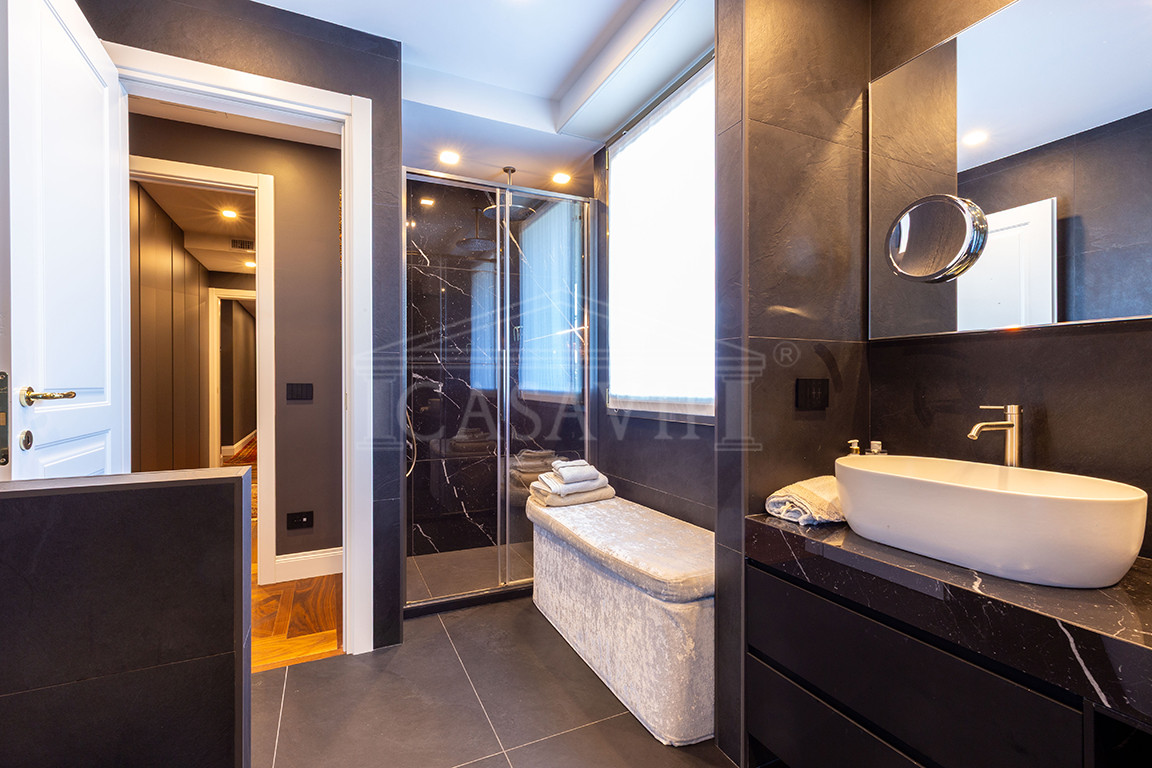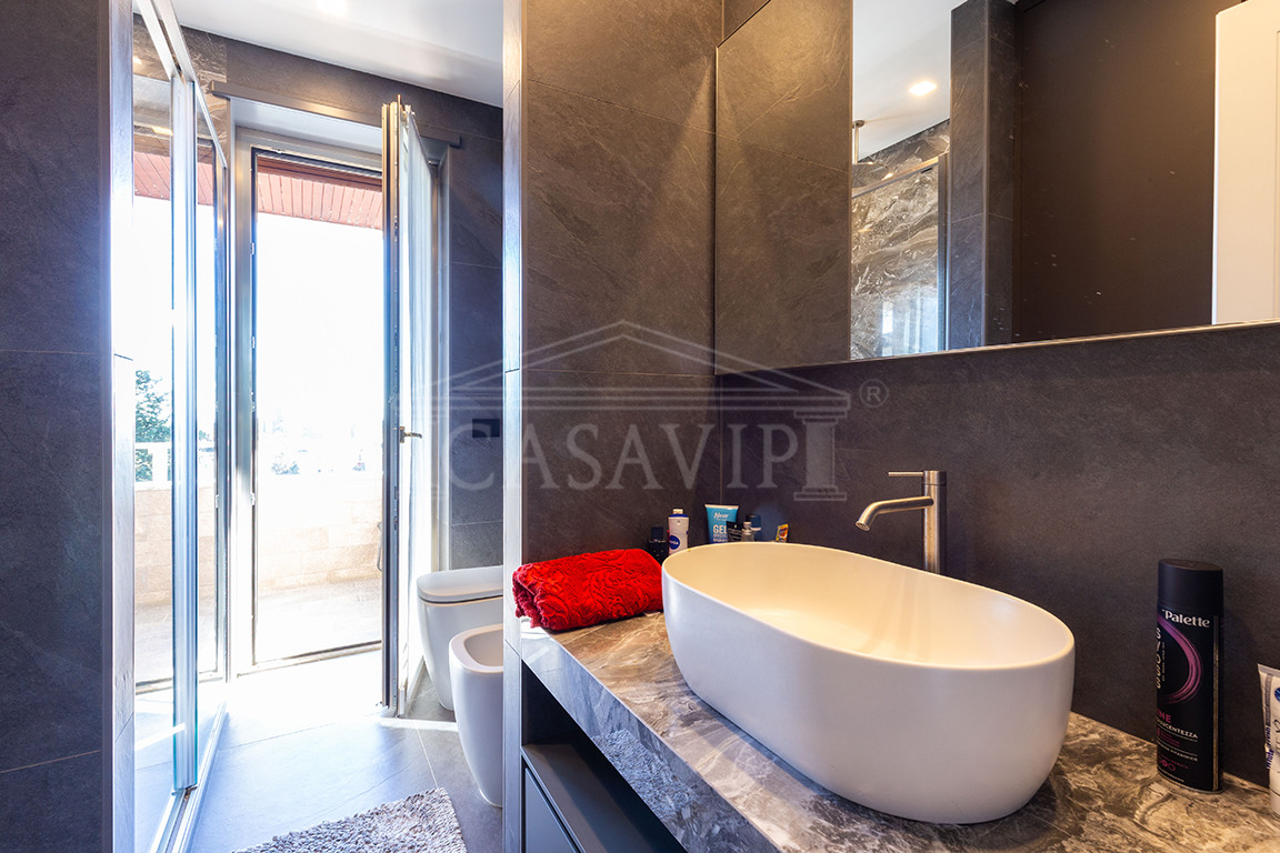 Assolutamente al top come già accennato il livello dei materiali impiegati e delle finiture, quali pavimenti in parquet pregiato, infissi in vetro camera di ultima generazione, sistema di climatizzazione dell’aria canalizzato a bocchette, bagni in marmo con docce emozionali, cucina su misura di elevatissimo standard qualitativo, impianti nuovi con relativa certificazione, impianto di allarme perimetrale.