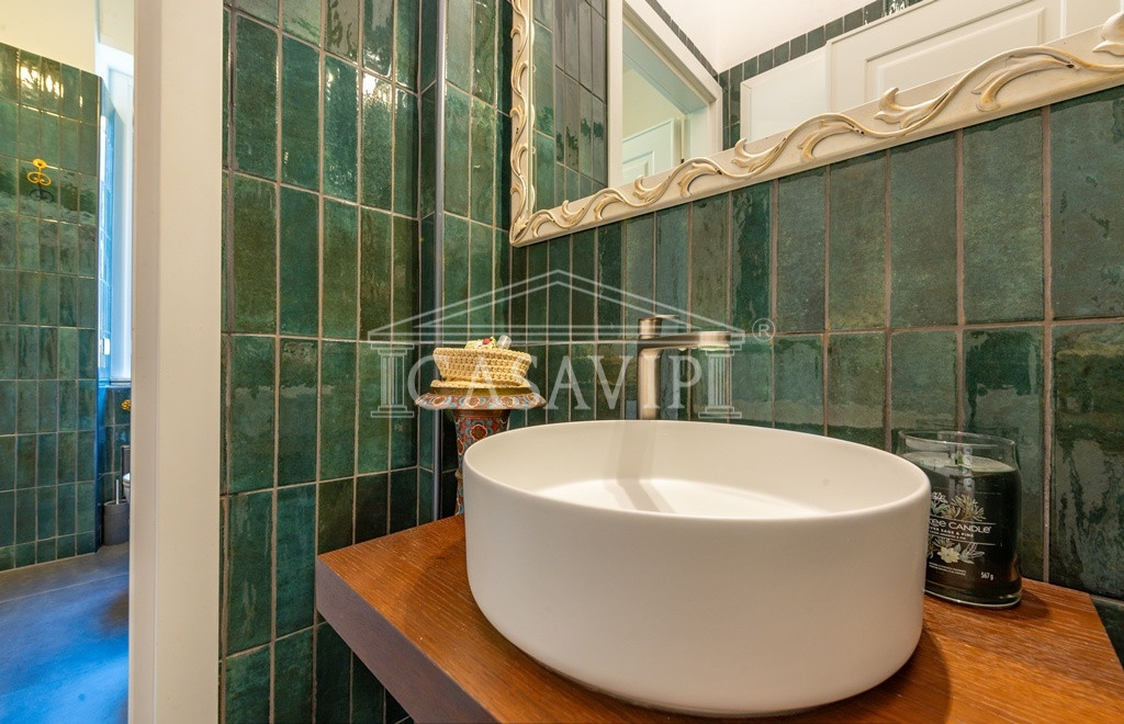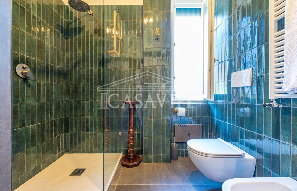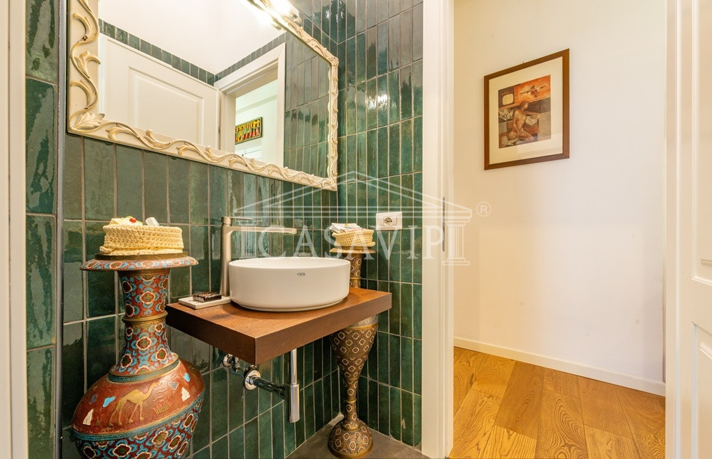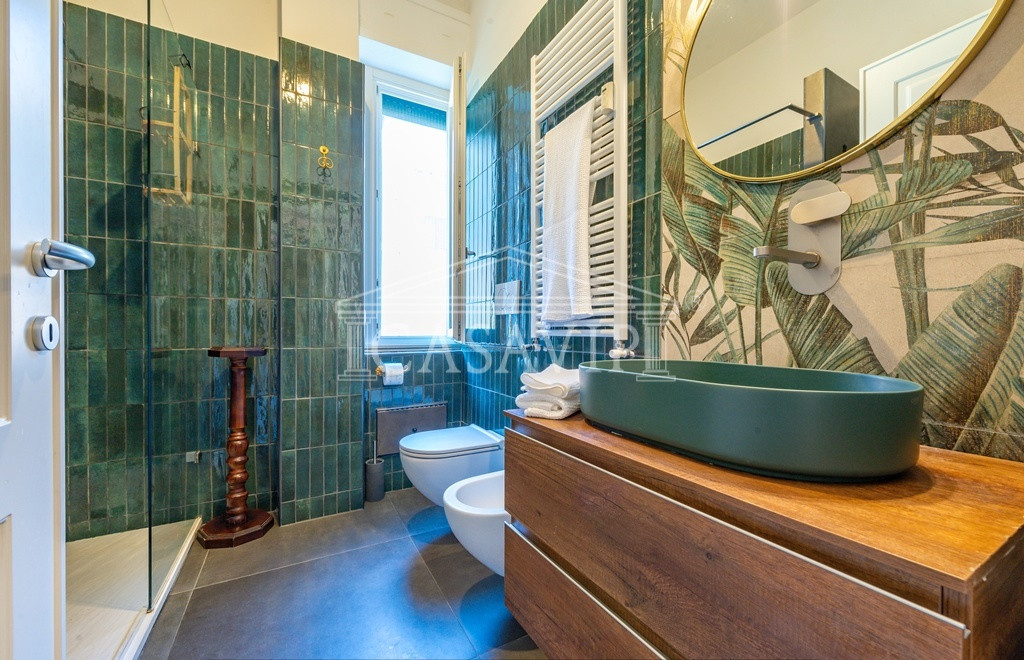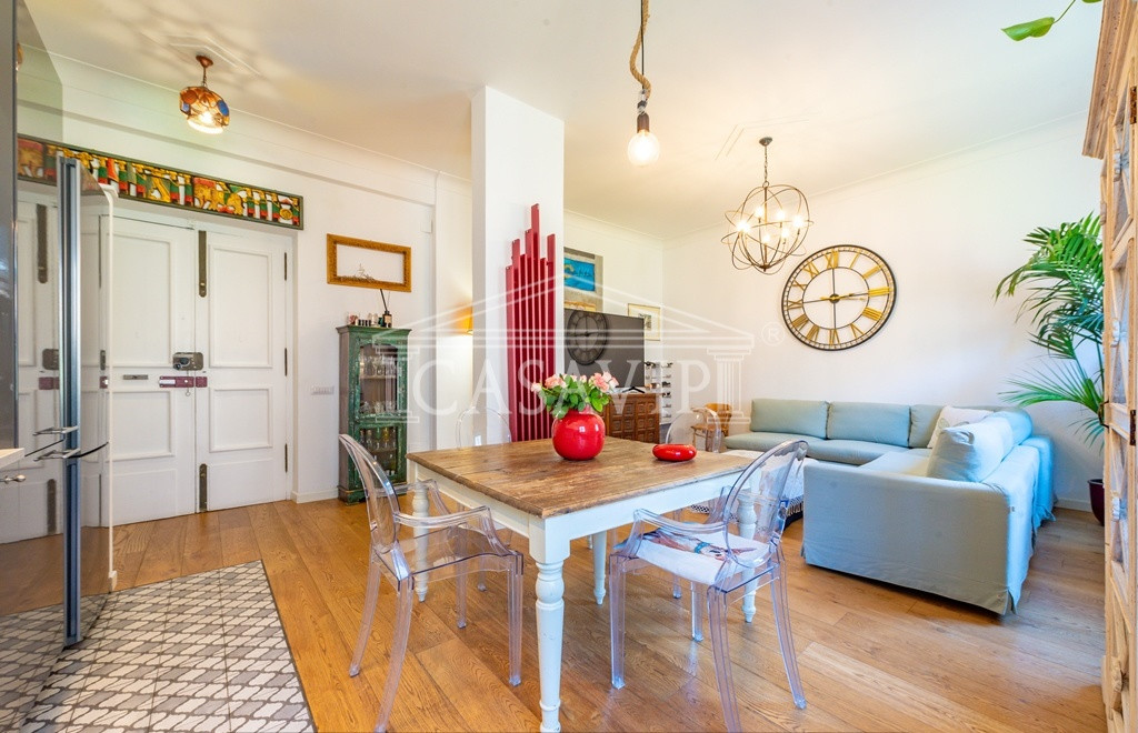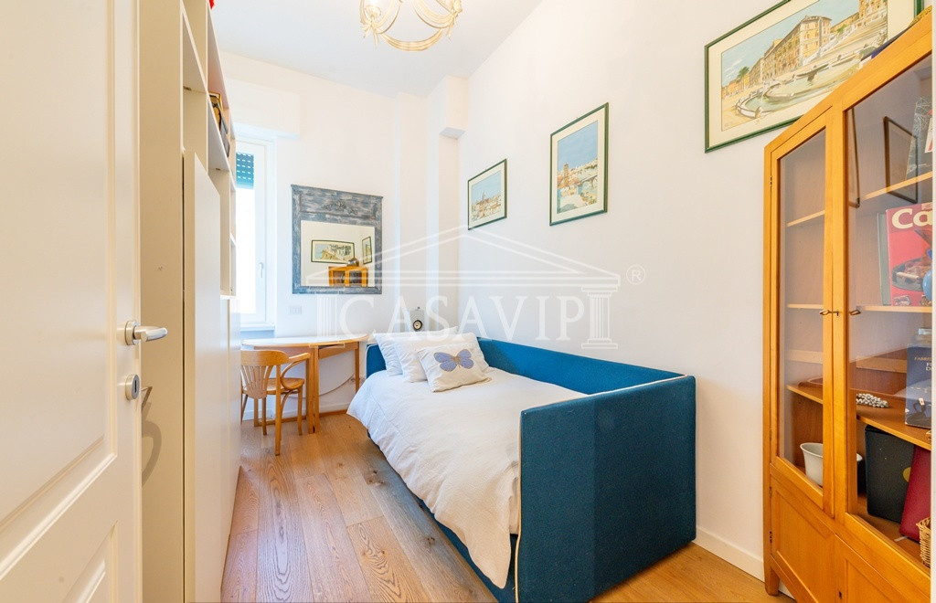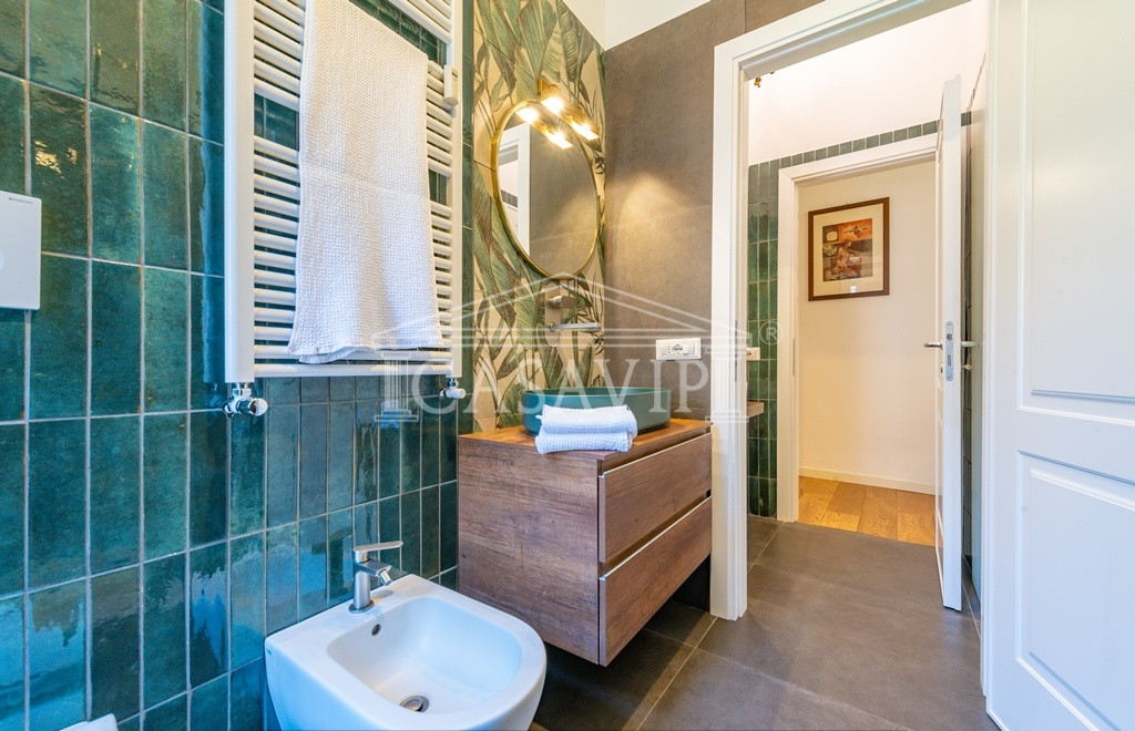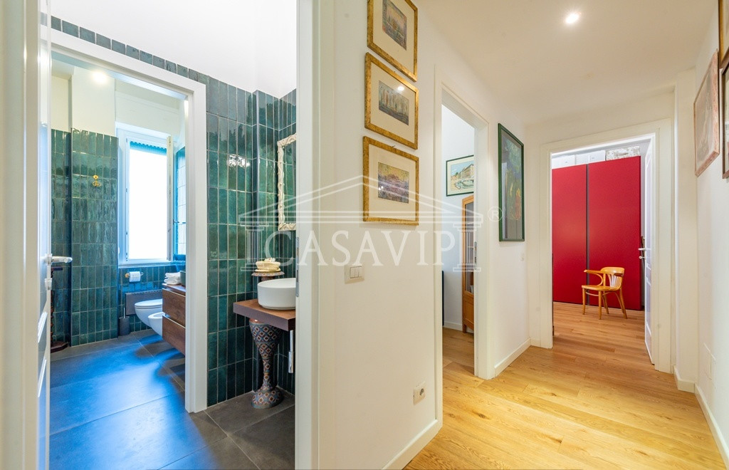L’appartamento, che si compone di ampio soggiorno con angolo cottura, una camera da letto matrimoniale e una camera singola, bagno con antibagno e ripostiglio, è stato di recente completamente ristrutturato con eleganti rifiniture e materiali di pregio.