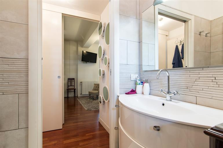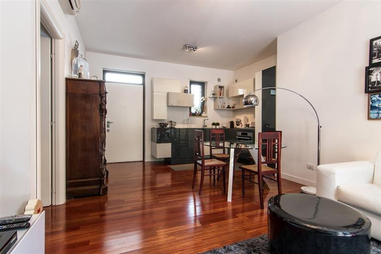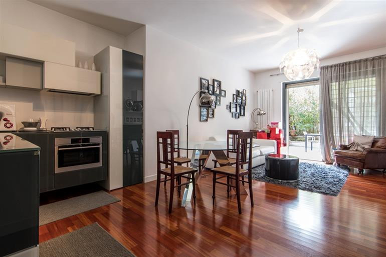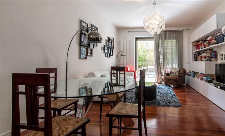 CORTINA D’AMPEZZO 60MQ CON GIARDINO INGR. INDIPENDENTE Lungo Viale Cortina D’ Ampezzo, d’angolo con Via di Vallombrosa, offriamo la rara opportunità di acquistare appartamento situato all’ interno di splendido complesso residenziale di classe energetica “A”, la cui edificazione è terminata nel 2010, arricchito da parco condominiale privato impreziosito da fontane circolari e fioriere, servizio di portineria ed ampi spazi comuni. Gli stabili che compongono il condominio sono infatti dotati di sistemi tecnologici avanguardistici per lo sfruttamento dell’energia rinnovabile quali pannelli solari termici per la produzione di acqua calda sanitaria e pannelli solari fotovoltaici; sono stati inoltre progettati ricercando l’utilizzo di materiali di altissima qualità edilizia e particolare attenzione è stata posta nella scelta di materiali e finiture sia degli interni sia degli esterni. L’appartamento, posto al piano terra, di circa 60 mq interni, a cui si accede da ingresso indipendente attraverso piccolo terrazzo passante di circa 12 mq, si compone di ampio salone con vetrata che permette l’uscita su godibile giardino in gran parte pavimentato di circa 40 mq, angolo cottura con finestra dedicata, camera da letto matrimoniale accessibile tramite disimpegno di divisione delle due zone della casa, bagno con doccia. Eccezionale il livello dei materiali impiegati, delle finiture della dotazione tecnologica, quali pavimenti in parquet in tutta casa, infissi in vetrocamera, aria condizionata, impianto di allarme, porta blindata, videocitofono, cancellate di protezione, vetri antisfondamento , termoautonomo. Possibilità di acquistare un box auto di circa 25 mq con serranda elettrica situato al piano interrato del complesso immobiliare con comodo accesso interno alla palazzina tramite ascensore. Classe Energetica : A