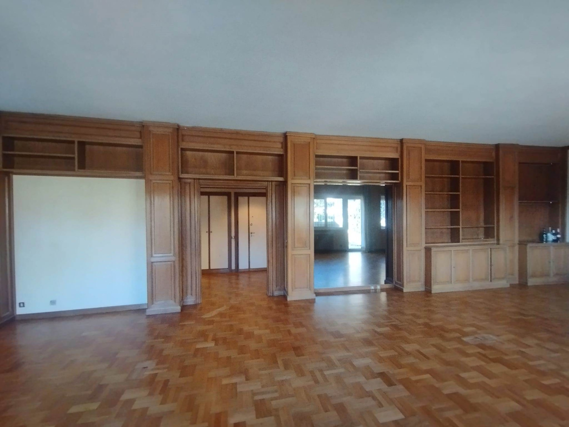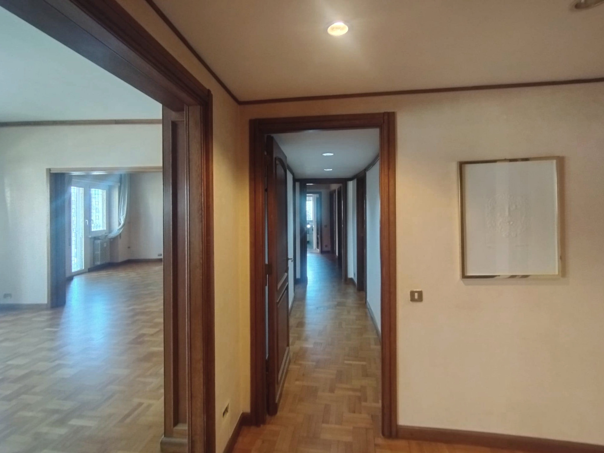 Nella prima troviamo ampio ingresso, salone triplo con uscita su balconate vivibili, sala da pranzo o studio utilizzabile anche come terza camera da letto visto che ha ingresso sia dalla zona giorno sia dalla zona notte e cucina. Nella zona notte sono situate due camere con armadi su misura, cameretta di servizio singola arredata di grande armadiatura e tre bagni.