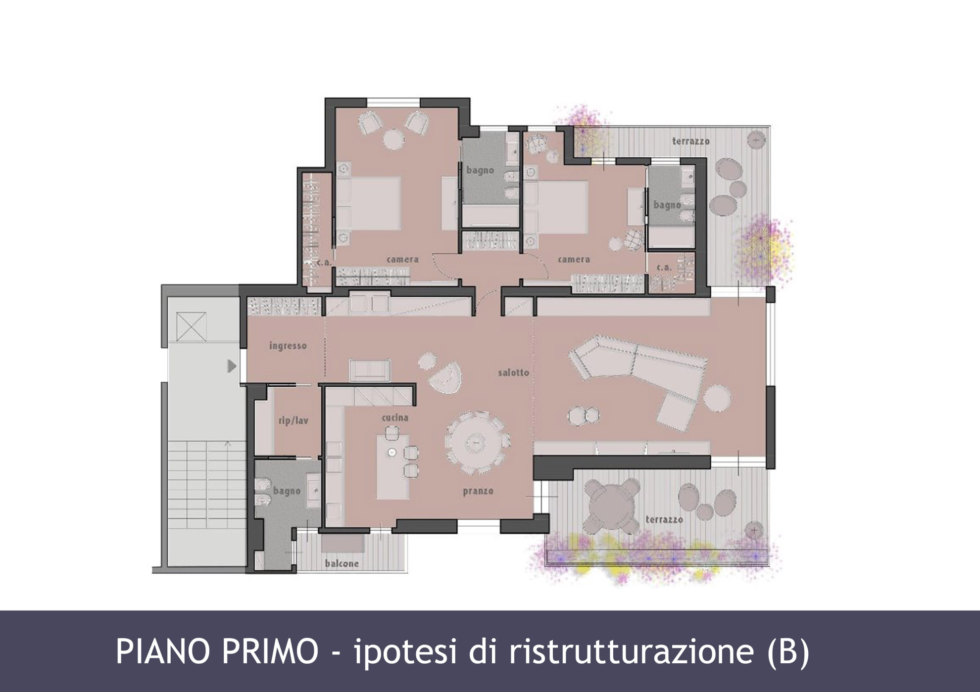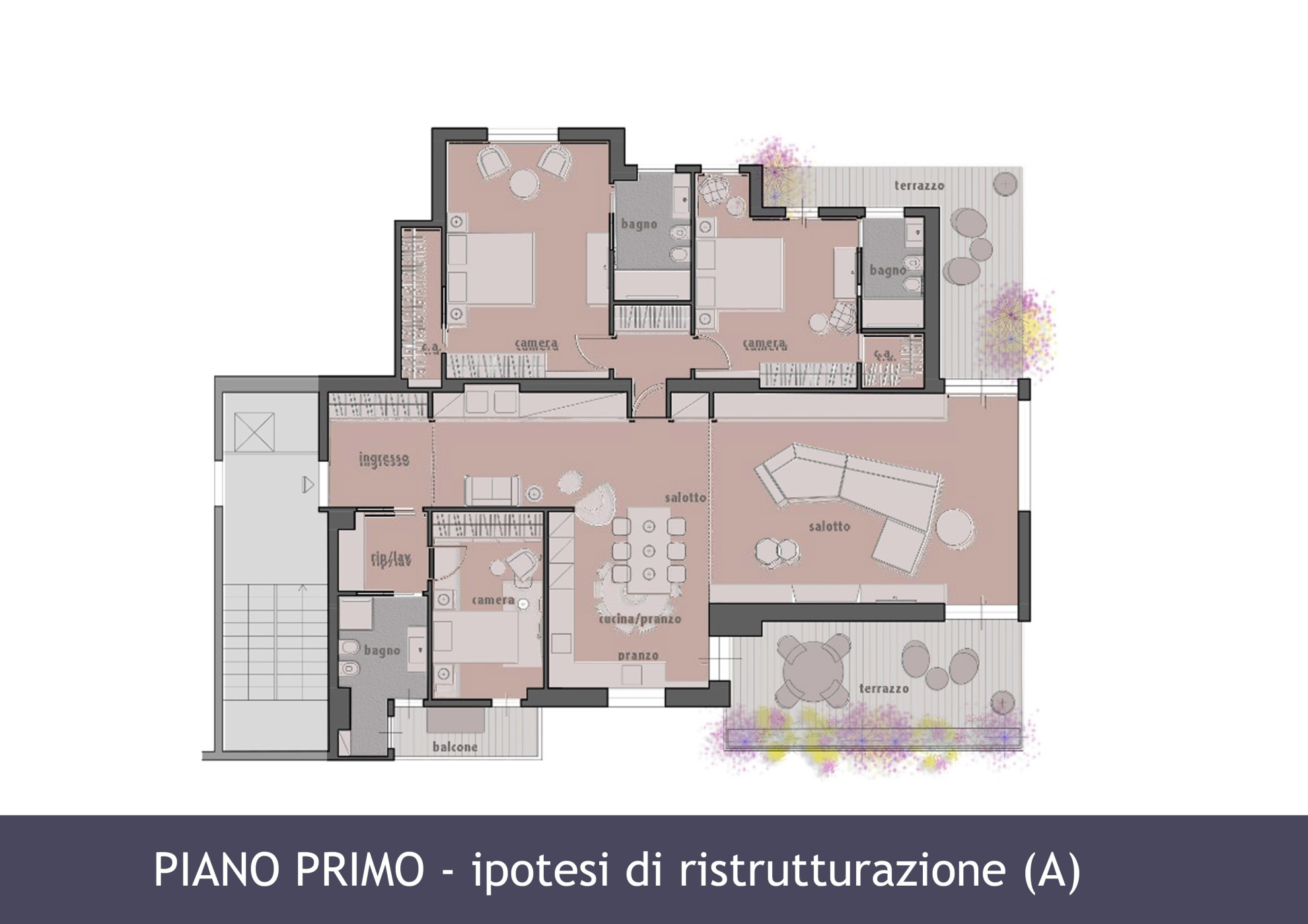L’immobile è caratterizzato da ampi ambienti ed è distribuito attualmente in 4 camere e 2 bagni, oltre la suite padronale con 1 bagno interno e camera armadi, in quanto in passato “zona notte” di appartamento di maggior consistenza, ma nell’ambito di necessaria opera di ristrutturazione l’immobile potrebbe essere trasformato in ampio salone di rappresentanza con uscita su due terrazze vivibili, contigua cucina separata od a giorno, due e tre camere padronali, a seconda di quanto grande si voglia la rappresentanza, servite da tre bagni, così come già rappresentato da progetti visibili nella galleria planimetrie.