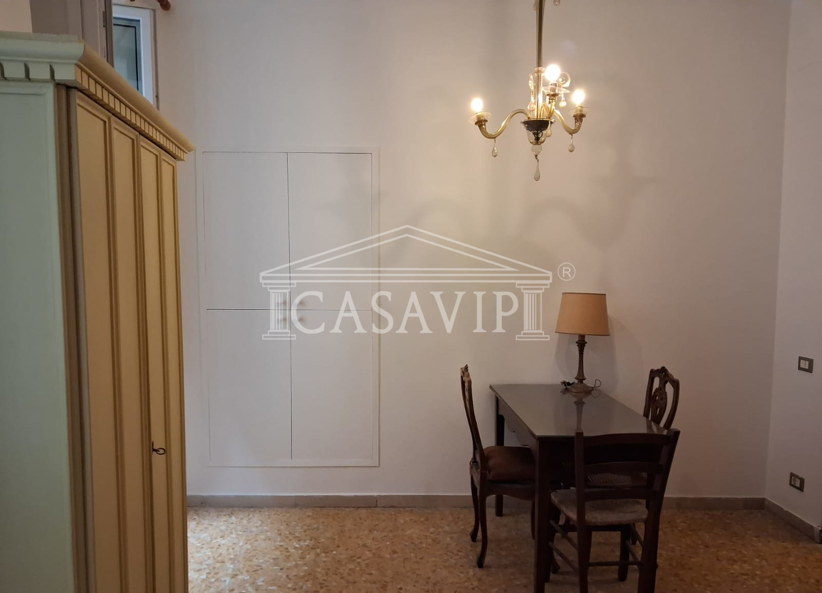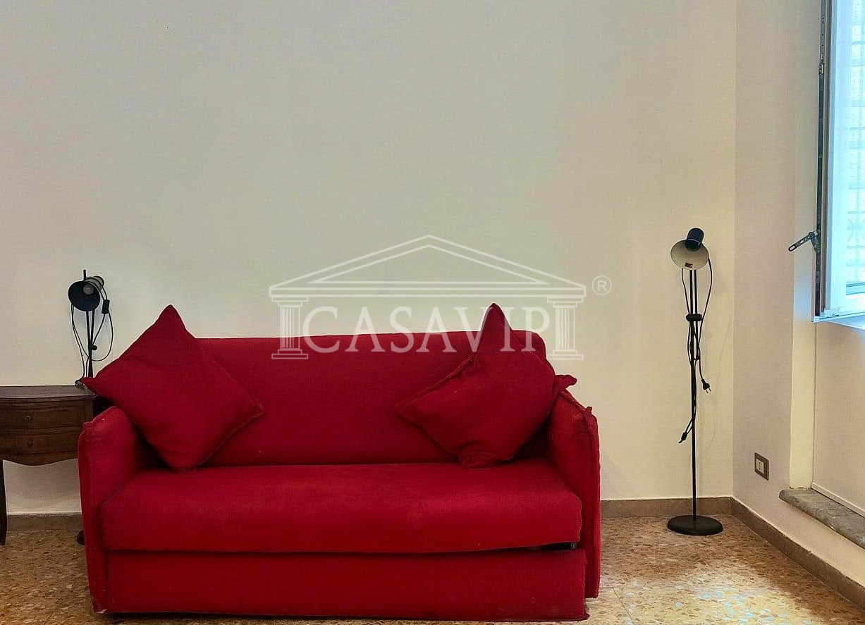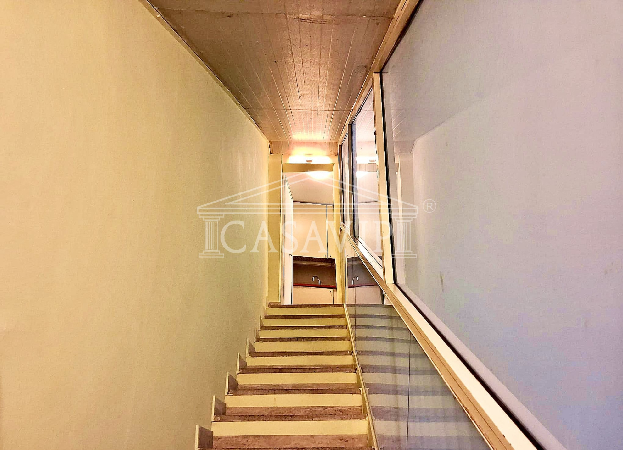 Dall'ingresso posto al primo piano dell'edificio, si entra in un corridoio di proprietà, lungo il quale è posizionato un grande armadio, da cui dipartono le scale di proprietà esclusiva che conducono al corpo vivibile dell'immobile, di consistenza pari a circa 40mq commerciali, composto da ingresso con angolo cottura, ampia camera con doppia finestra sulla tranquilla Via degli Artisti e bagno con cabina doccia.